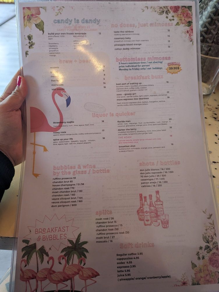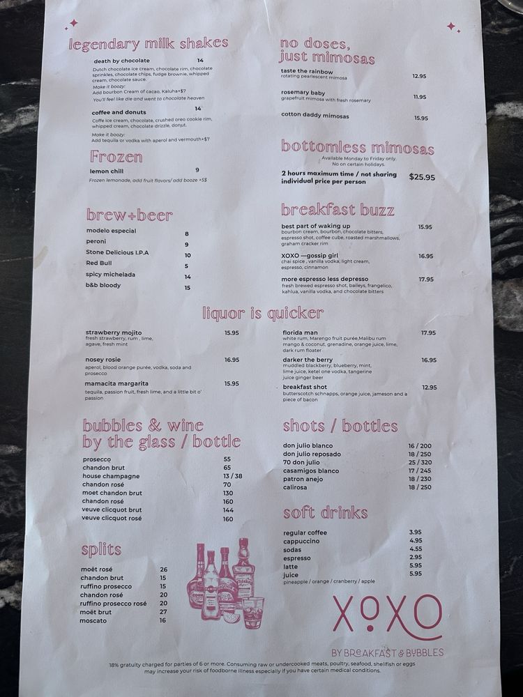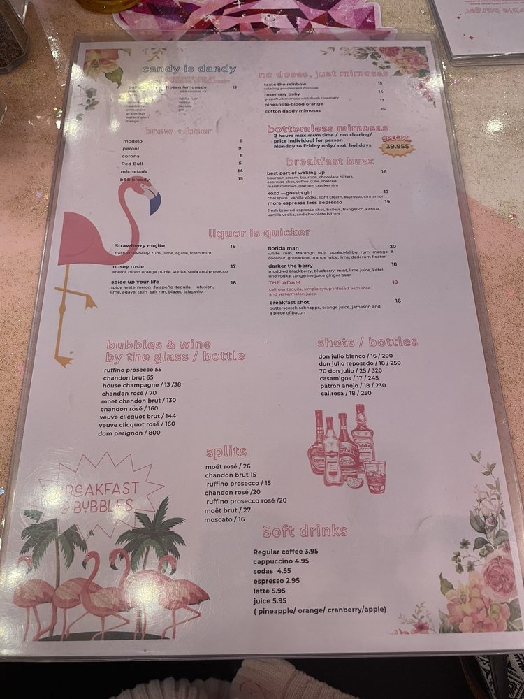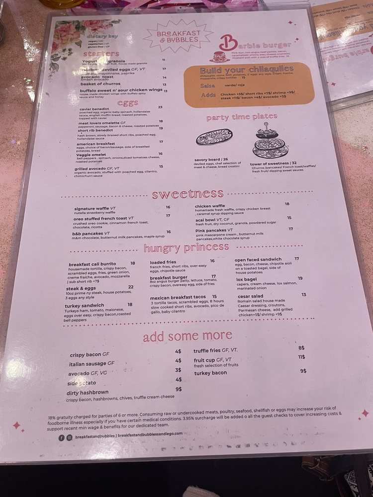 Introducing Breakfast & Bubbles, a trendy and vibrant restaurant located at 3831 Park Blvd in San Diego, CA. This hip and tourist-friendly spot offers a range of amenities such as reservations, takeout, delivery, vegan options, and more. The chic pink decor and playful atmosphere make it perfect for social media posts, while the indulgent treats like pink Espresso Martinis are a hit with customers. The menu showcases a variety of dishes with stunning presentations that are sure to impress. Whether you're looking for a fun brunch spot or a place to enjoy a cocktail with friends, Breakfast & Bubbles has something for everyone. So come on in, grab a seat at their outdoor seating area, and experience the luxury and fun that this restaurant has to offer.